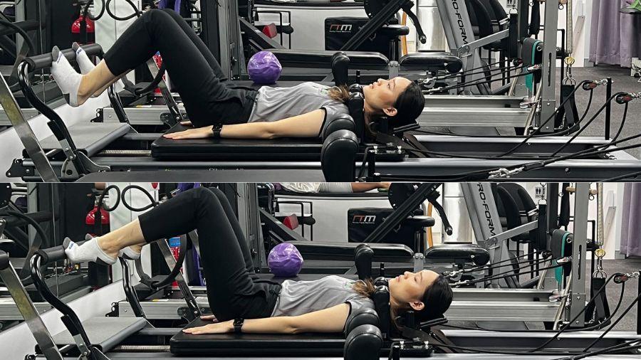 How do I do the exercise: Lye on your back on the reformer, place both toes on the foot bar. Push through your feet to slide the reformer, slightly extending your legs. Keeping the knees bent in a half squat position, drop your heels below the bar and push to raise the heels up. The level of difficulty and intensity can be varied by adjusting spring resistance or by progressing to one legged raises.
