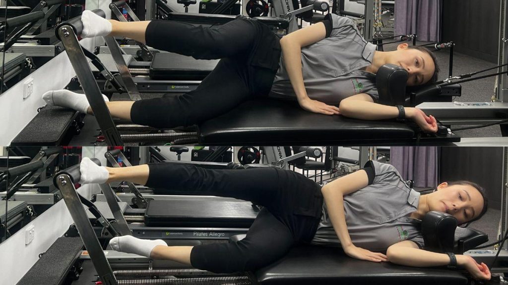 How do I do the exercise: Lying on your side on the reformer with your hips facing forward, place the top leg on the foot bar parallel to the ground. Press out against the foot bar to extend the top leg and move the carriage up, then flex/bend the knee to bring the carriage back down. Ensure that your knee stays in line with your second toe (or lifts slightly towards the sky) as you squat to further target your gluteus medius. Level of difficulty can be adjusted changing spring resistance.