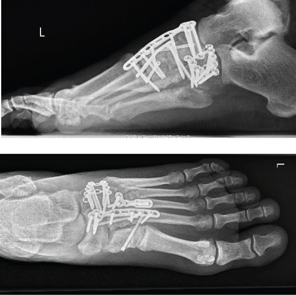 Surgery is typically recommended for all injuries with a fracture in the joints of the midfoot or with abnormal positioning (subluxation) of the joints. The goal of surgical treatment is to realign the joints and return the broken (fractured) bone fragments to a normal position, via Internal fixation. Delaying surgical treatment if needed is associated with poor functional outcomes (Welck, Zinchenko, & Rudge, 2014). In this procedure, the bones are positioned correctly (reduced) and held in place with plates or screws. Because the plates or screws will be placed across joints that normally have some motion, some or all this hardware may be removed typically around the 8 week post-op mark however this is at the surgeon’s discretion.